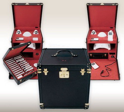 以旅行為核心價值的Louis Vuitton可以為客戶訂制各種特殊要求的旅行箱。有一位來自中國的客戶請Louis Vuitton訂制了一款移動娛樂站,箱子里有電視、DVD和咖啡機。無論你在機場還是在印度大吉嶺,隨時都可以娛樂。如果擔心能源問題則完全不必,燒咖啡有一罐汽油儲備,看DVD更有太陽能電池保證……